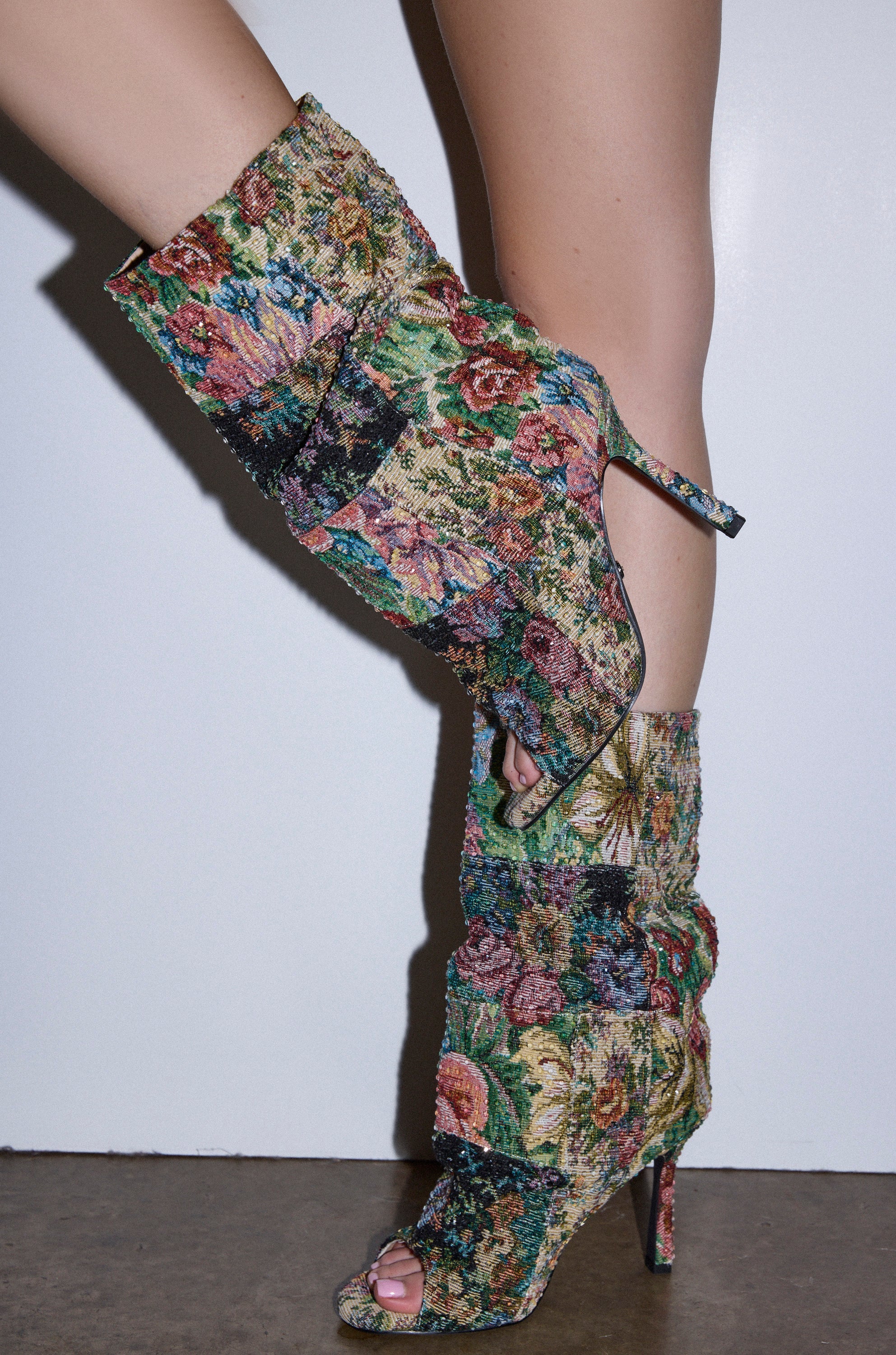 The AZALEA WANG Jonice Floral Rhinestone Embellished Open Toe Bootie is a luxe blend of vintage inspiration and modern glamour. Wrapped in a tapestry-style floral pattern. this bootie shimmers with rhinestone embellishments that add depth and sparkle to its intricate design. The open toe and flared stiletto heel create a chic. elongated silhouette. while the slouched shaft offers a relaxed yet elevated vibe. A true statement shoe. it's perfect for styling with both edgy night-out looks and romantic. fashion-forward ensembles.