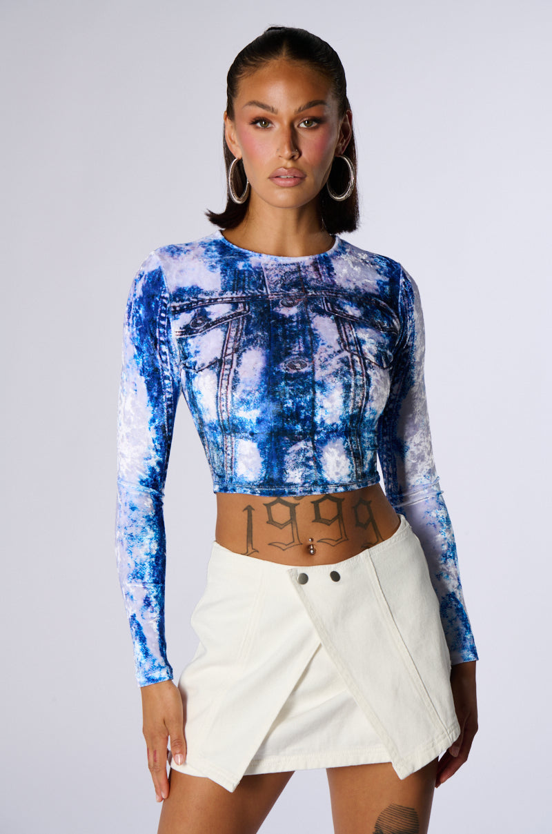 The AKIRA Label Love Is Wild Top is a playful piece crafted from super soft and stretchy crushed velvet. It features a cropped silhouette. scoop neckline. long sleeves. and a cheeky jean jacket-inspired graphic print throughout. Style it with baggy denim pants and chunky boots for a finished look.