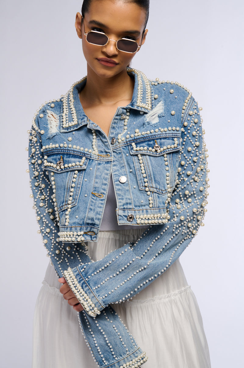 The AKIRA Label Lucky You Cropped Pearl Denim Jacket is a washed jean jacket featuring a non-stretch cotton composition. a studded point collar. long sleeves with buttoned cuffs. distressed accents. contour seaming. dual buttoned flap chest pockets. a cropped silhouette. and button down front closures. Complete with ornate pearl bead detailing adorning the body. forming a multi-pattern design. and intricately forming a lattice-style construction along the arms and upper back.