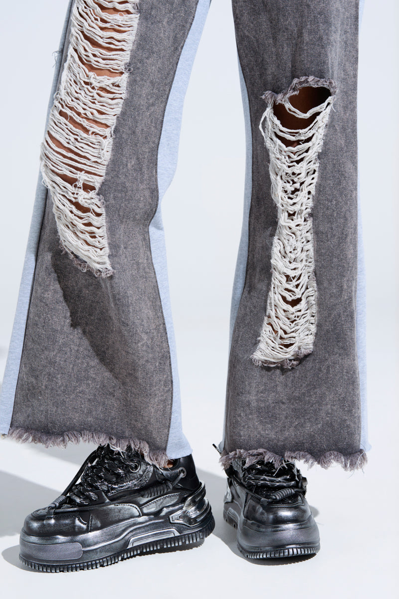 Level up your shoedrobe with the Metamorphosis Black Flatform Distressed Sneaker. These chunky lace-up sneakers feature a bold. sculpted flatform sole with deep ridges and a metallic sheen that adds a cyberpunk twist to your step. Crafted from sleek. textured faux leather and detailed with hardware-inspired accents and textured overlays. this shoe captures the aesthetic of industrial streetwear with a fashion-forward edge.