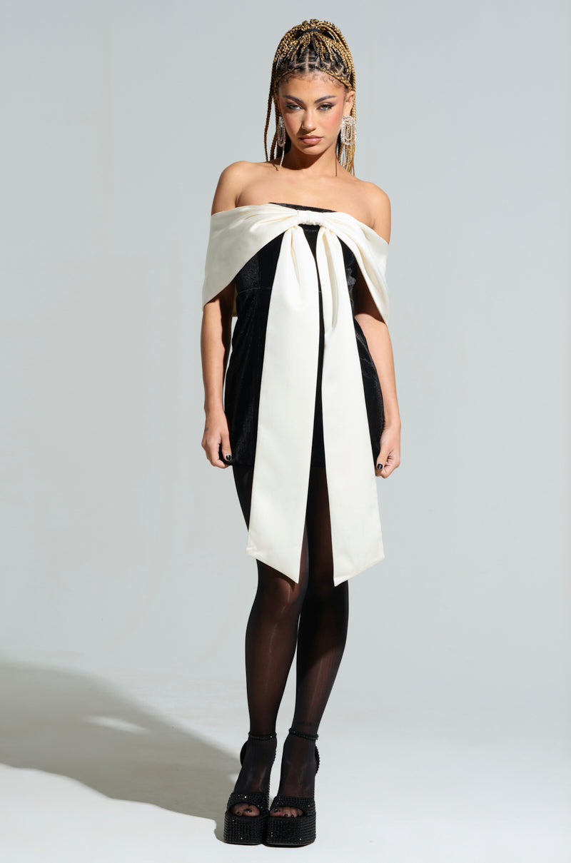 You're a gift to the universe — don't let anyone convince you otherwise! The AKIRA Label My Presence Is A Present Velvet Mini Dress is a stunning strapless style crafted from soft. semi-stretchy velvet. It features a curve-hugging fit and an extra-large. elegant satin bow attachment that drapes off-the-shoulder. Complete with slick inner lining and a tonal zip back closure. Style it with patterned tights. sleek pumps. and a fab fur coat for a sexy and sophisticated ensemble.