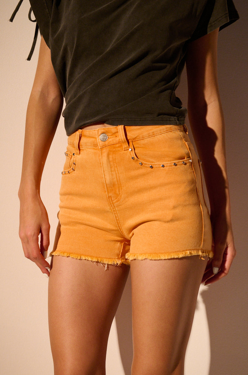 The AKIRA Label Ready To Rock Orange Denim Short is a pair of colored denim bottoms featuring a semi-stretchy cotton blend composition. a high rise waist with functional belt loops. faux silver metallic hardware. a classic five-pocket design. and circular stud embellishments along the front and back. Complete with a mini short silhouette. frayed hem detailing. and a front zip-up buttoned closure.