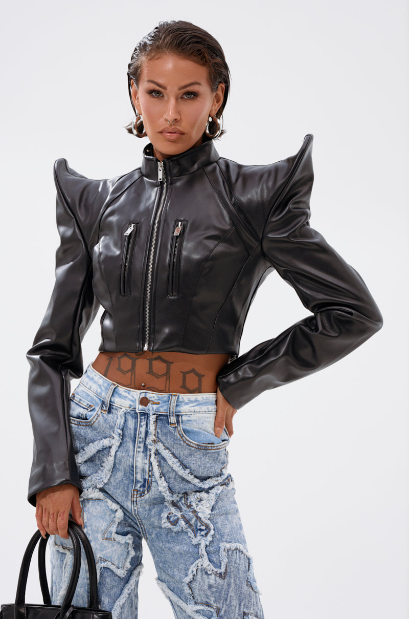 Cut to the chase in The AKIRA Label Straight To The Point Moto. Crafted from sleek premium faux leather. this statement jacket features a mock neck. exaggerated pointed shoulders. precision seam detailing. long sleeves. dual front zip pockets. a front zip closure. silver-tone hardware. and a tonal inner lining. Complete with a body-contouring. cropped fit. Pair it with a corset. a mini leather skirt. and platform boots for a finished look.