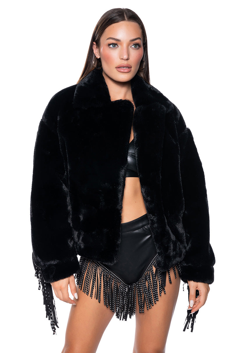 It's showtime! The AKIRA Label Time To Shine Studded Fringe Faux Fur Coat In Black is made from a plush faux fur fabrication and features a wide notch collar. long sleeves with wide cuffs. slick polyester lining. a boxy silhouette. an elastic waistband. and hook and eye front closures. Complete with studded fringe detailing along the back and sleeves.