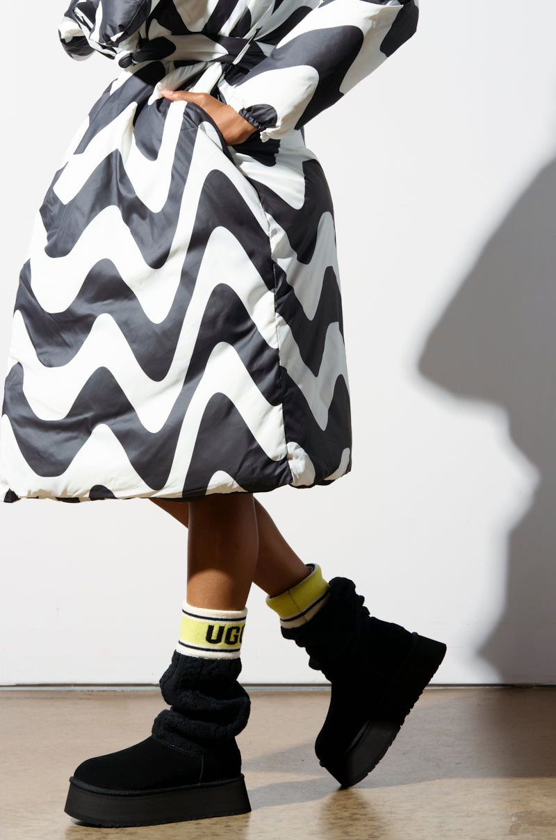 Ski chalet chic! Whisk yourself off to a cozy state of mind with The UGG Classic Sweater Letter Boot in Black. This updated take on the classic UGG features a leg warmer-inspired cable knit shaft. a ribbed knit cuff emblazoned with the UGG logo. a round toe design. fuzzy shearling lining. and a chunky platform base. Complete with an UGG logo embroidered at the back. a pull-on fit. and a textured rubber outsole. Pairs perfectly with cardigans. joggers and leggings.