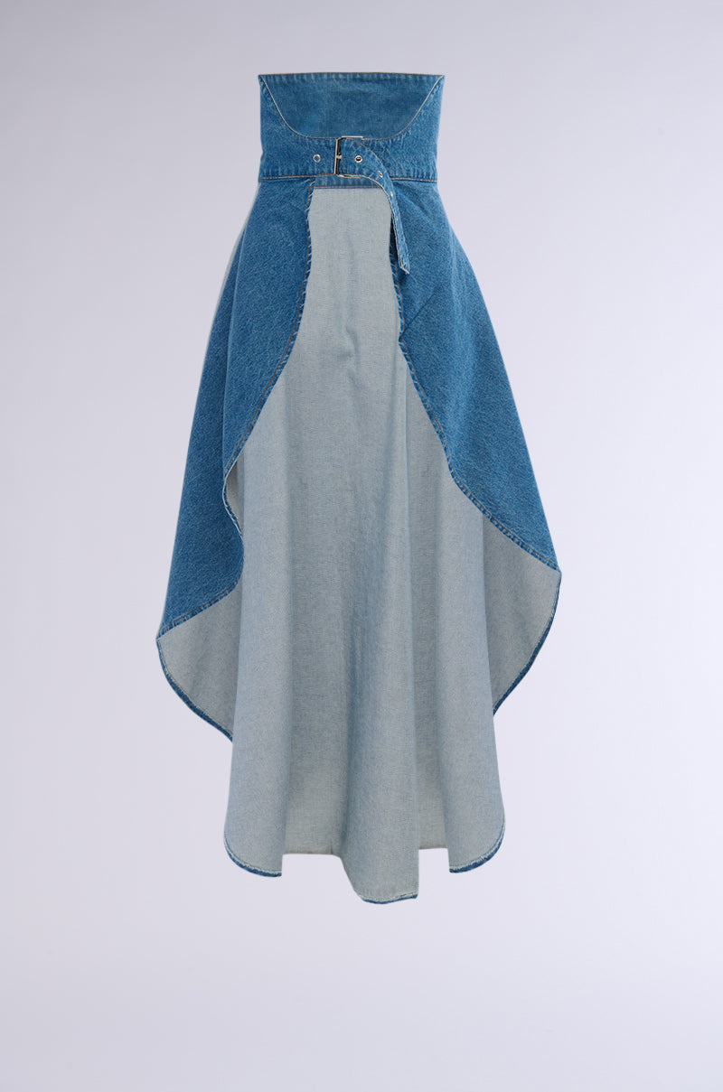The AKIRA Label Walk On The Wild Side Denim Waist Belt is made from a cotton base denim fabrication and features a wide band base. a silver metallic buckle closure. and an attached long skirt train. Sits atop the waist for a cinched look